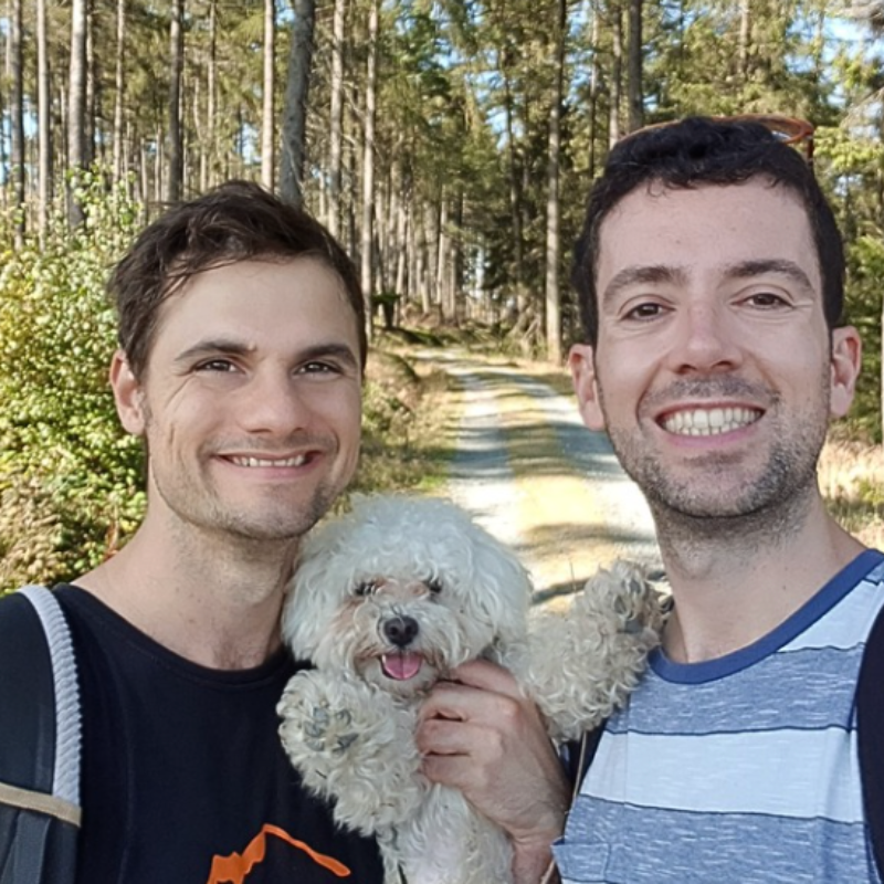 We’re Pol and Balázs, a married gay couple in our thirties, originally from Spain and Hungary, now living in Germany (let’s say we met halfway 😉). Since 2023, our small family has also included Copito (or “small flake” in English), our little fluffy Maltese dog, whom we adopted from a neighbor. He’s playful, a bit cheeky, and the heart of our home.